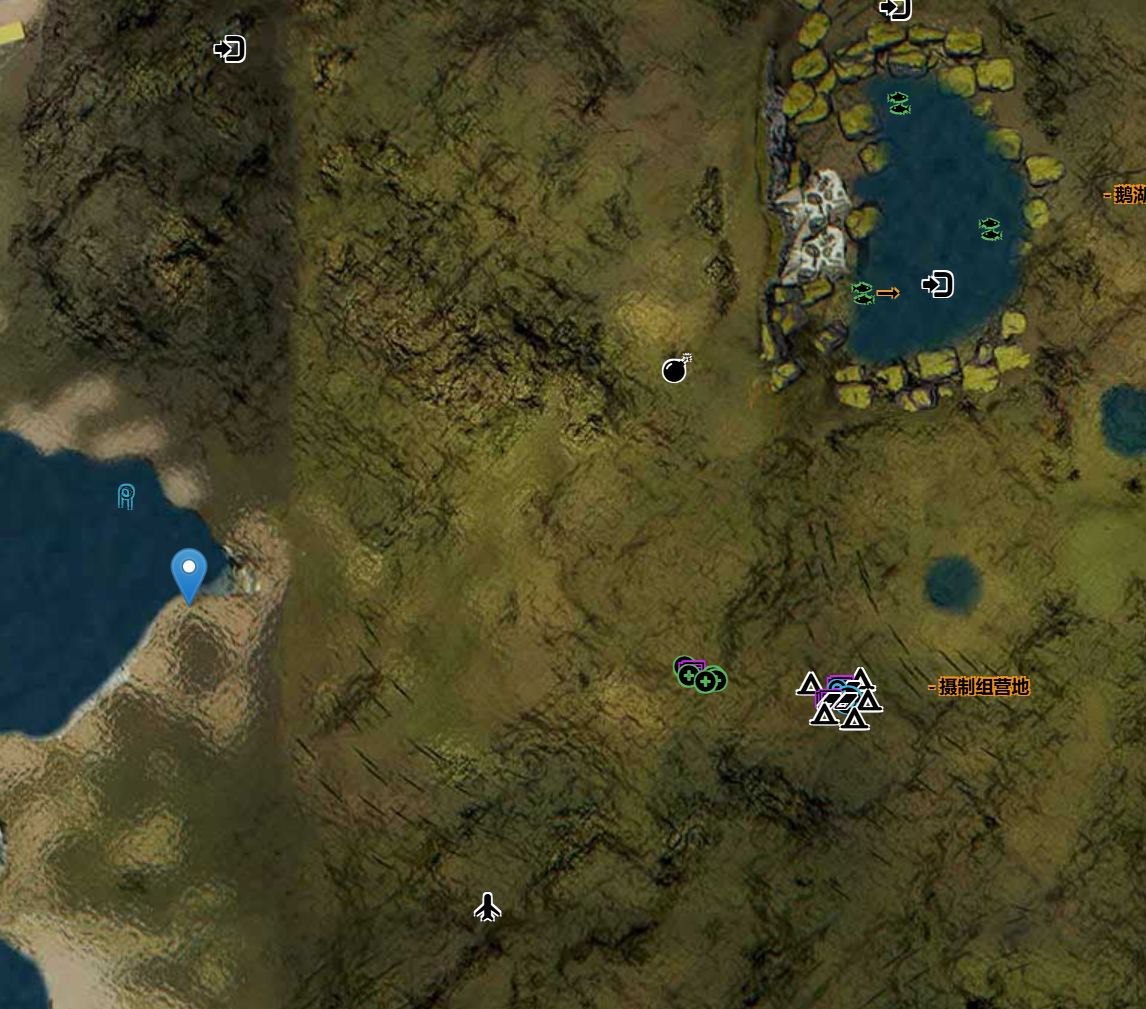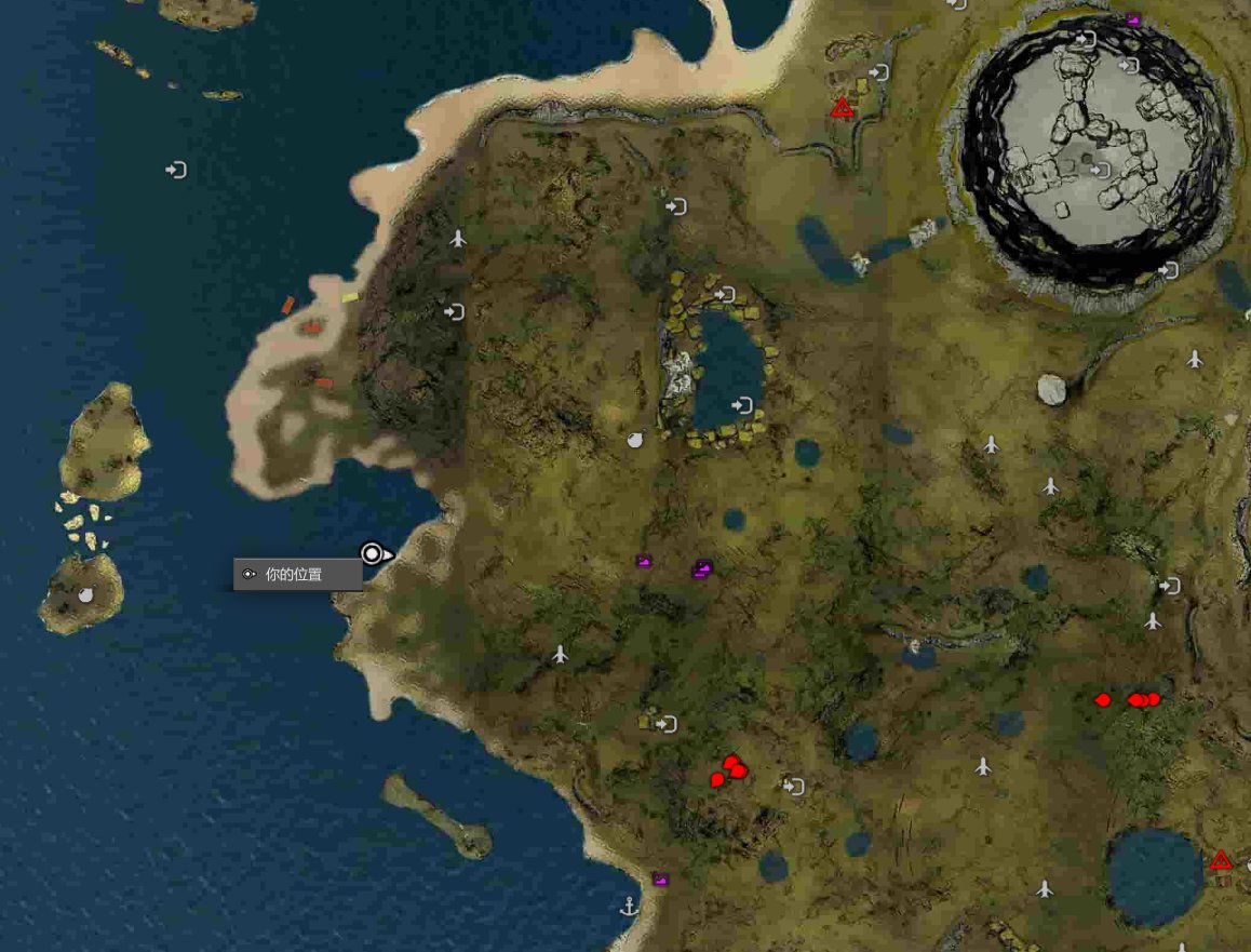 位置一:稿主最喜歡的位置,靠海地形開闊,每天都有源源不斷的海龜爬上岸,根本不缺食物。在這附近有一個出生點位(圖上飛機位置不準確,應該在炸彈標誌那旁邊),在出生點位旁有攝製組營地,攝製組營地每天都會刷大量現代箭,打起來比自制箭手感好不少。