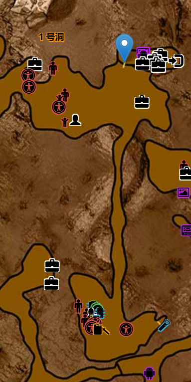 藍點爲浣熊,黃點爲野豬,飛機爲出生點,炸彈爲火槍零件,門爲洞口。圖1