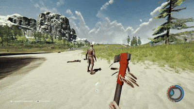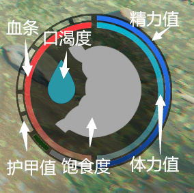 說一下人物狀態指示,小方格爲護甲值,一個甲佔一個格。紅色爲生命值,水滴爲口渴度,胃圖標爲飽食度。淺藍靠內的條爲體力值,像跑步揮砍格擋這類動作消耗體力值。靠外深藍爲精力值,精力值的作用就是決定體力值的上限,假設精力只有10點那麼體力最多回到10點,可以從坐椅子,喝蘇打水等方式補充。