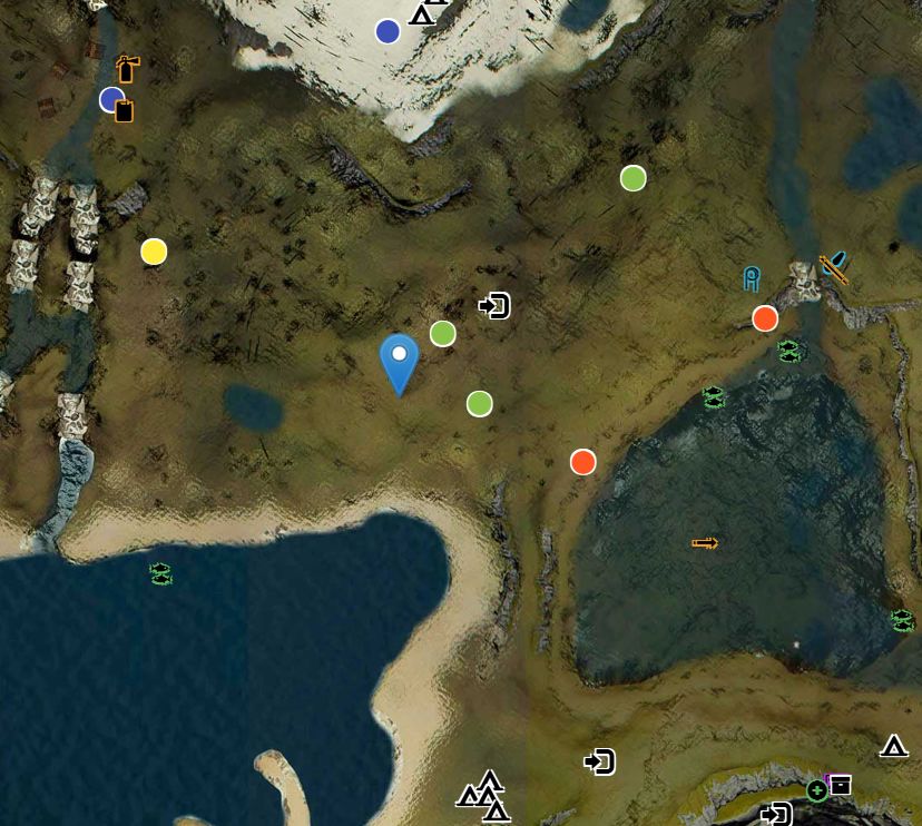 位置三:靠北邊的陸地,適合玩過森林的老鳥,這附近容易刷野人和鱷魚需注意。綠點爲陸龜,黃點爲野豬,野豬是很重要的資源。