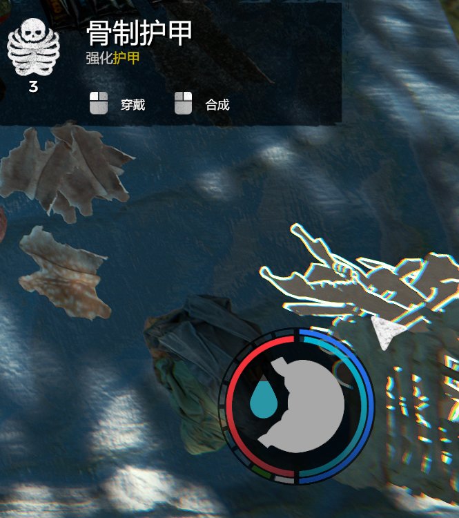 骨甲是由六個骨頭加三個布合成,打死的野人不要丟棄,造個小火堆把幾個死野人丟上去,過一會沒用的野人就能變成一堆骨頭。骨甲是森林中最常用但防禦力不是最高的,別的甲待會會在戰鬥部分講。