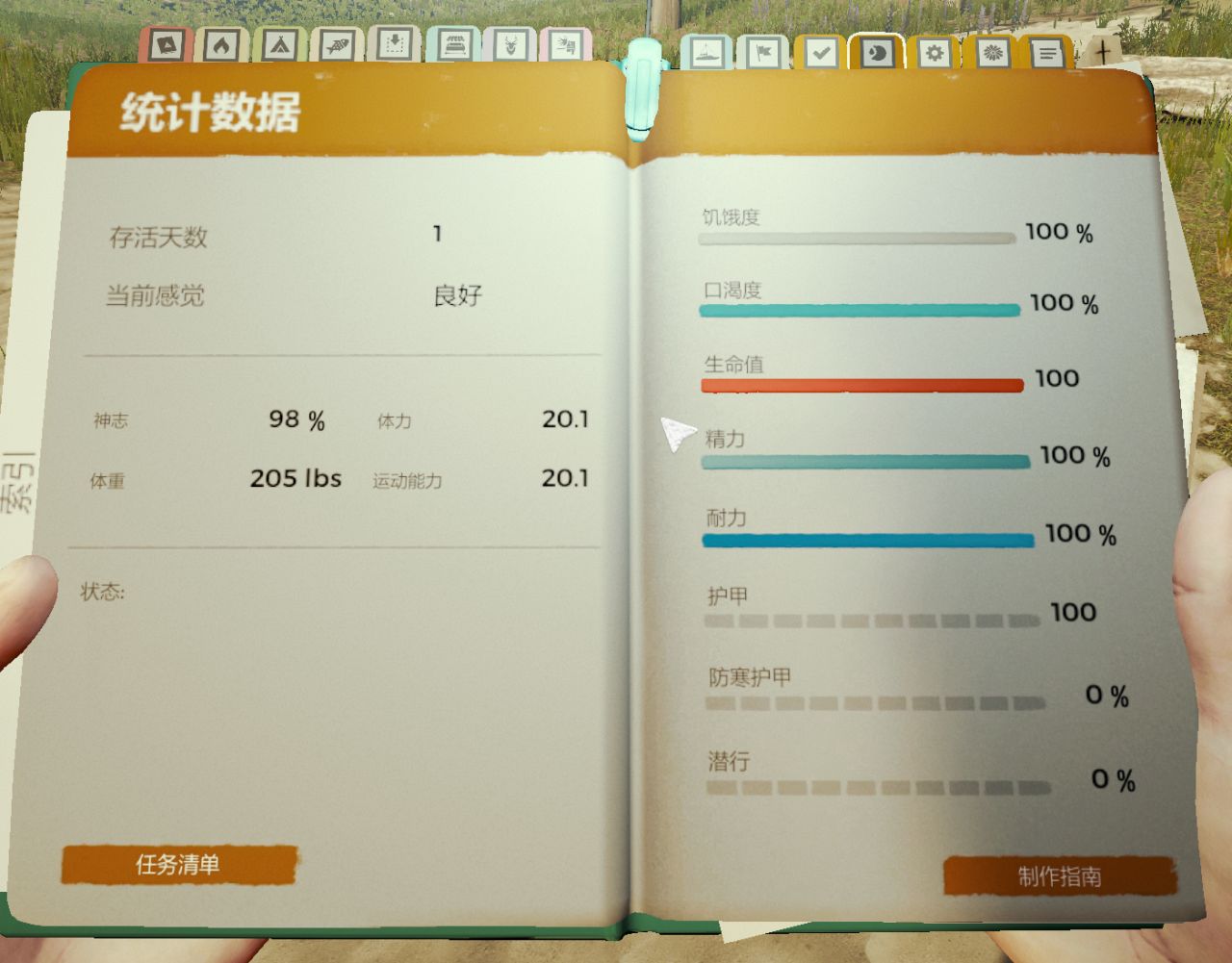 除了這幾個基礎數值外,還有幾個高級屬性:抗寒護甲、潛行值、體重、力量值(體力)、運動能力以及神智值。這些屬性可以在建造書 中的統計數據查看。