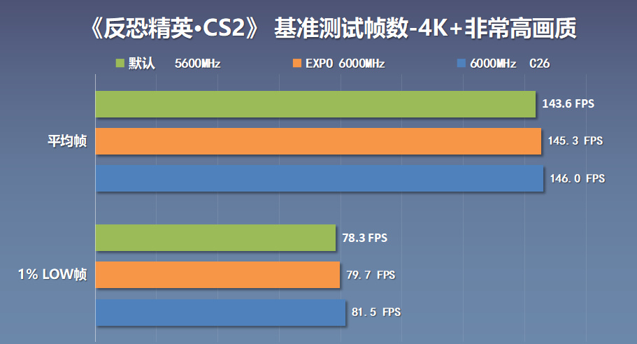 《反恐精英·CS2》基準測試,非常高畫質,4K分辨率下,原生5600MHz時,遊戲平均幀數爲143.6 FPS,1%LOW幀爲78.3 FPS。開啓EXPO至6000MHz後,遊戲平均幀數爲145.3FPS,1%LOW幀爲79.7 FPS。將時序設爲C26-36-36-70後,遊戲平均幀數爲146 FPS,1%LOW幀爲81.5 FPS;