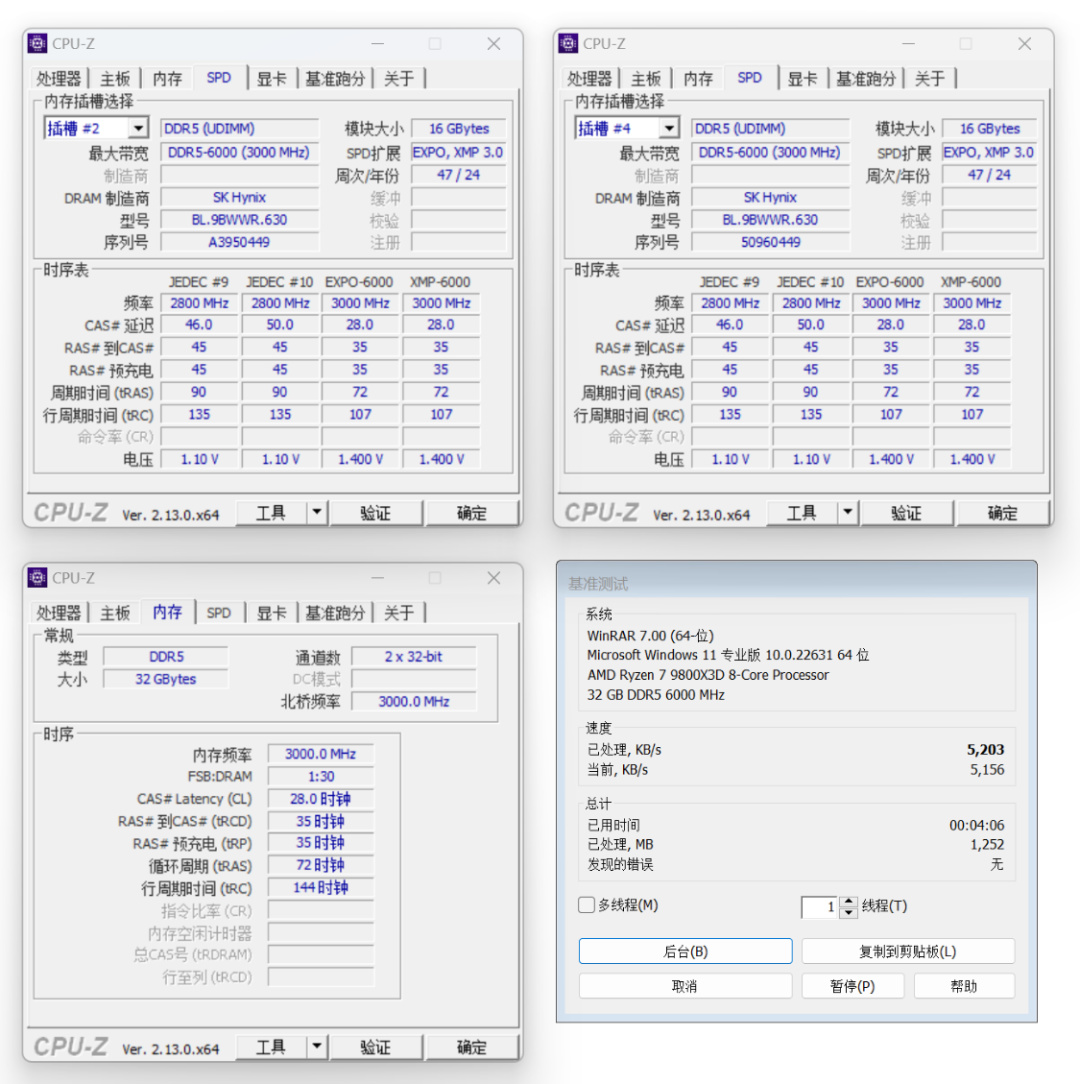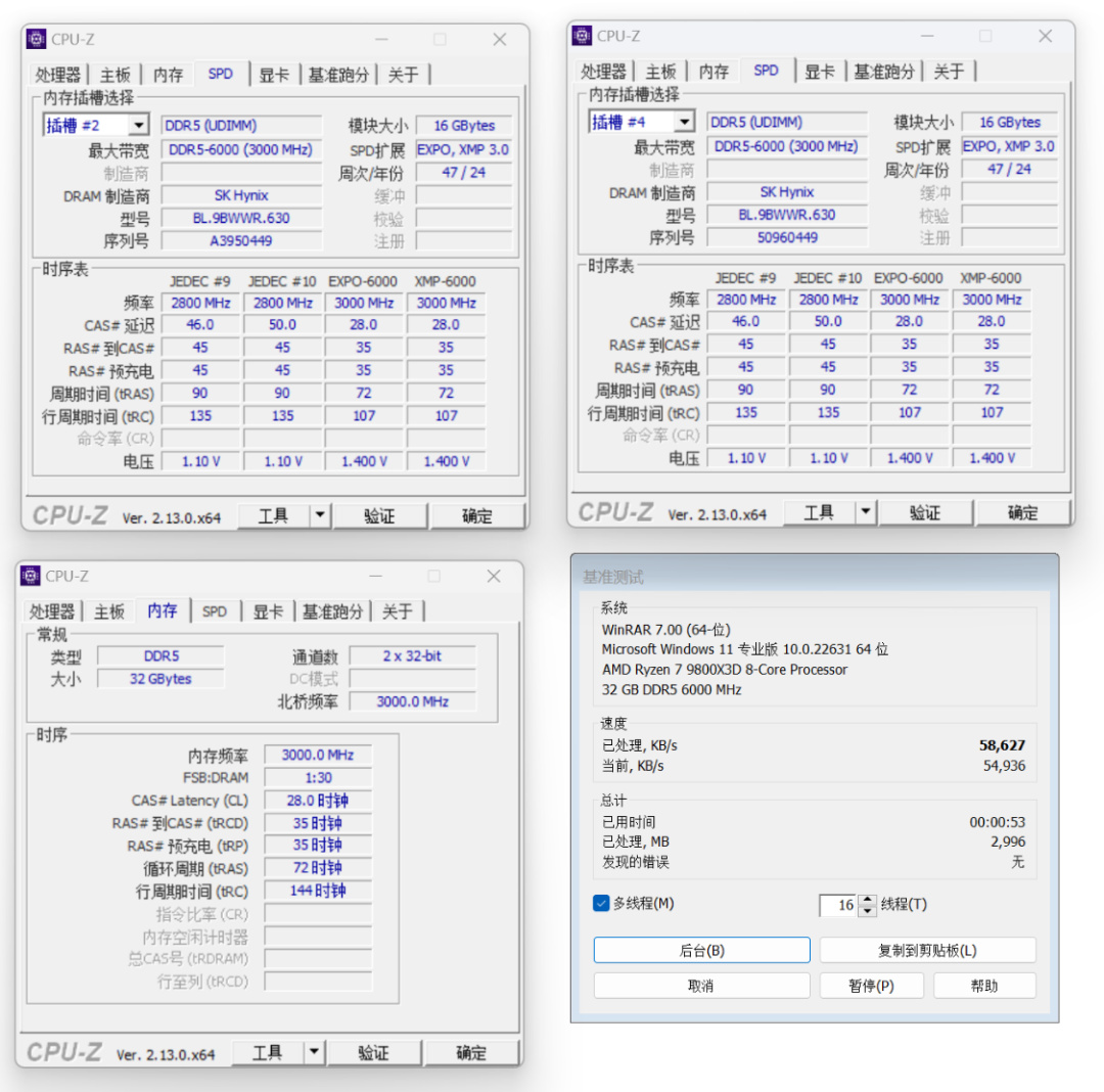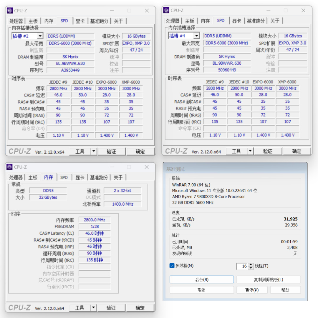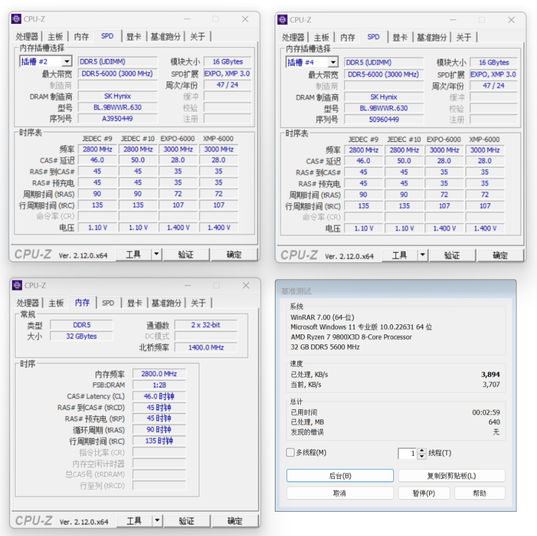 WinRAR解壓縮基準測試,原生5600MHz狀態下,多線程處理速度爲31925 KB/s,單線程處理速度爲3894KB/s;