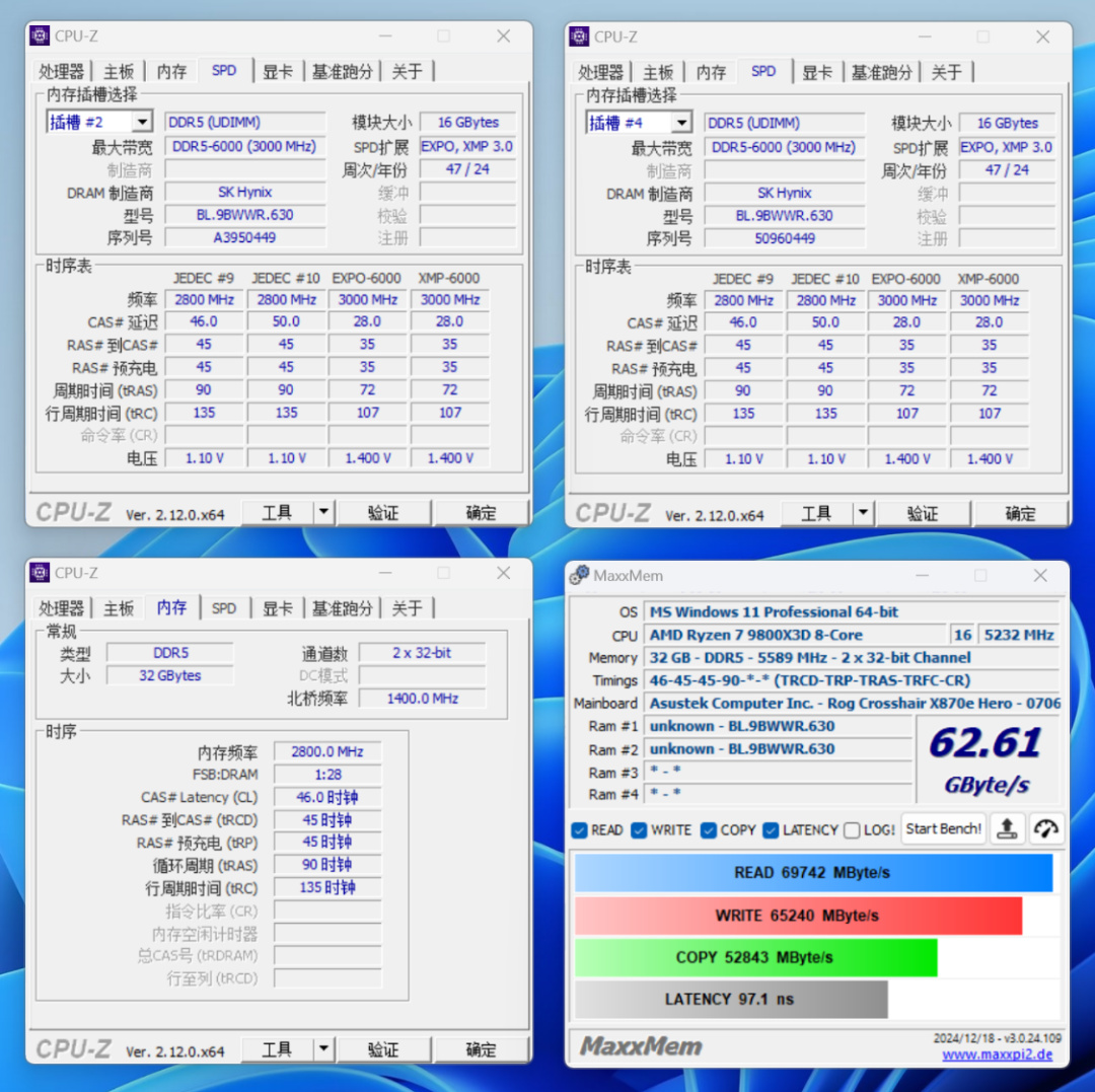 MaxxMem內存讀寫測試,原生5600MHz狀態下,內存讀寫帶寬爲62.61GByte/s;