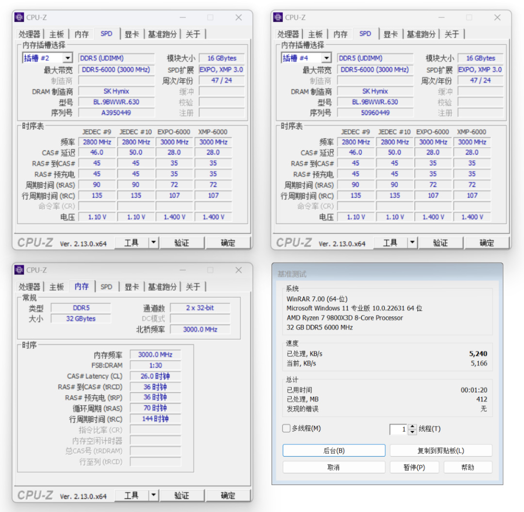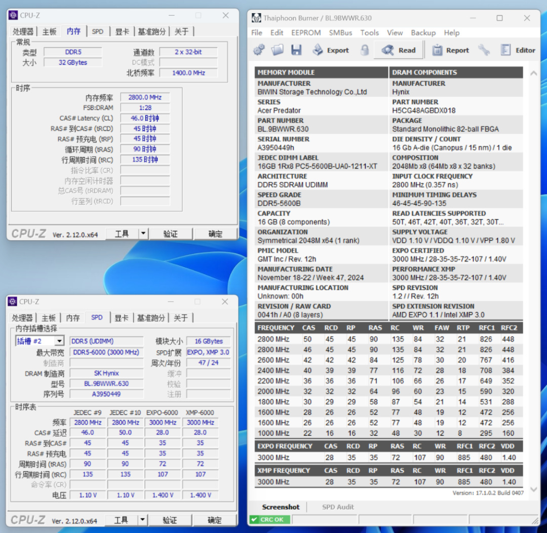 內存馬甲採用不可拆卸設計,但我們可以通過軟件查看內存的SPD信息,內存採用了全新的海力士A-DIE顆粒,內存默認頻率爲5600MHz,並且內存還支持XMP與EXPO內存超頻技術,兼容性表現優秀;