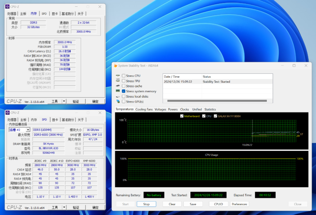 內存烤機測試,手動將內存時序調整至C26-36-36-70後,使用Aida 64對內存進行烤機測試,烤機10Min,內存無報錯;