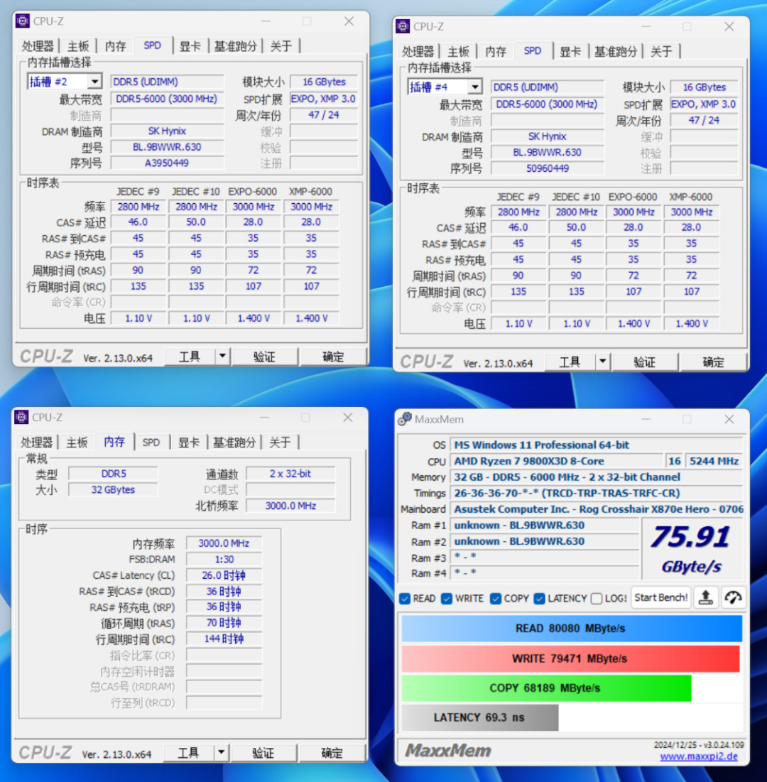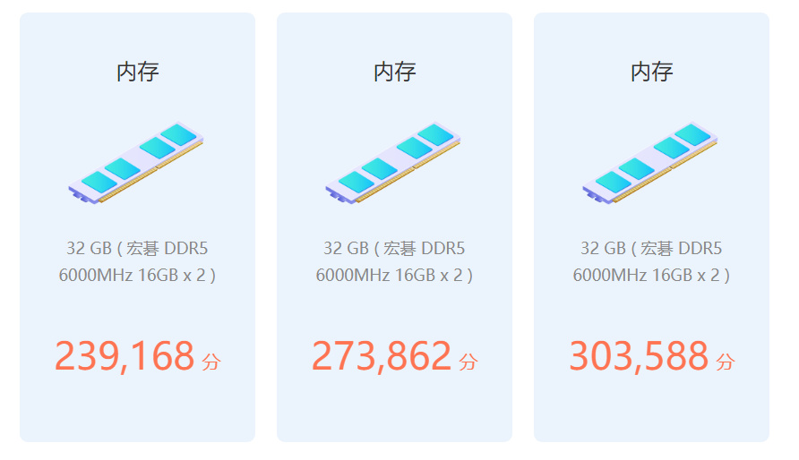 原生5600MHz,魯大師內存項目得分23.9W;EXPO至6000MHz,內存得分27.3W分;手動將時序壓低至C26-36-36-70,內存得分30.3W分。