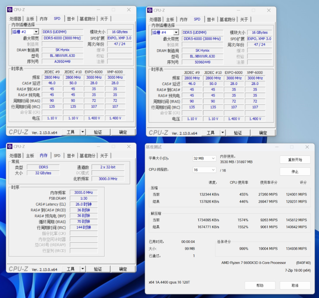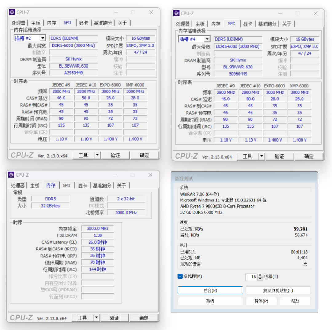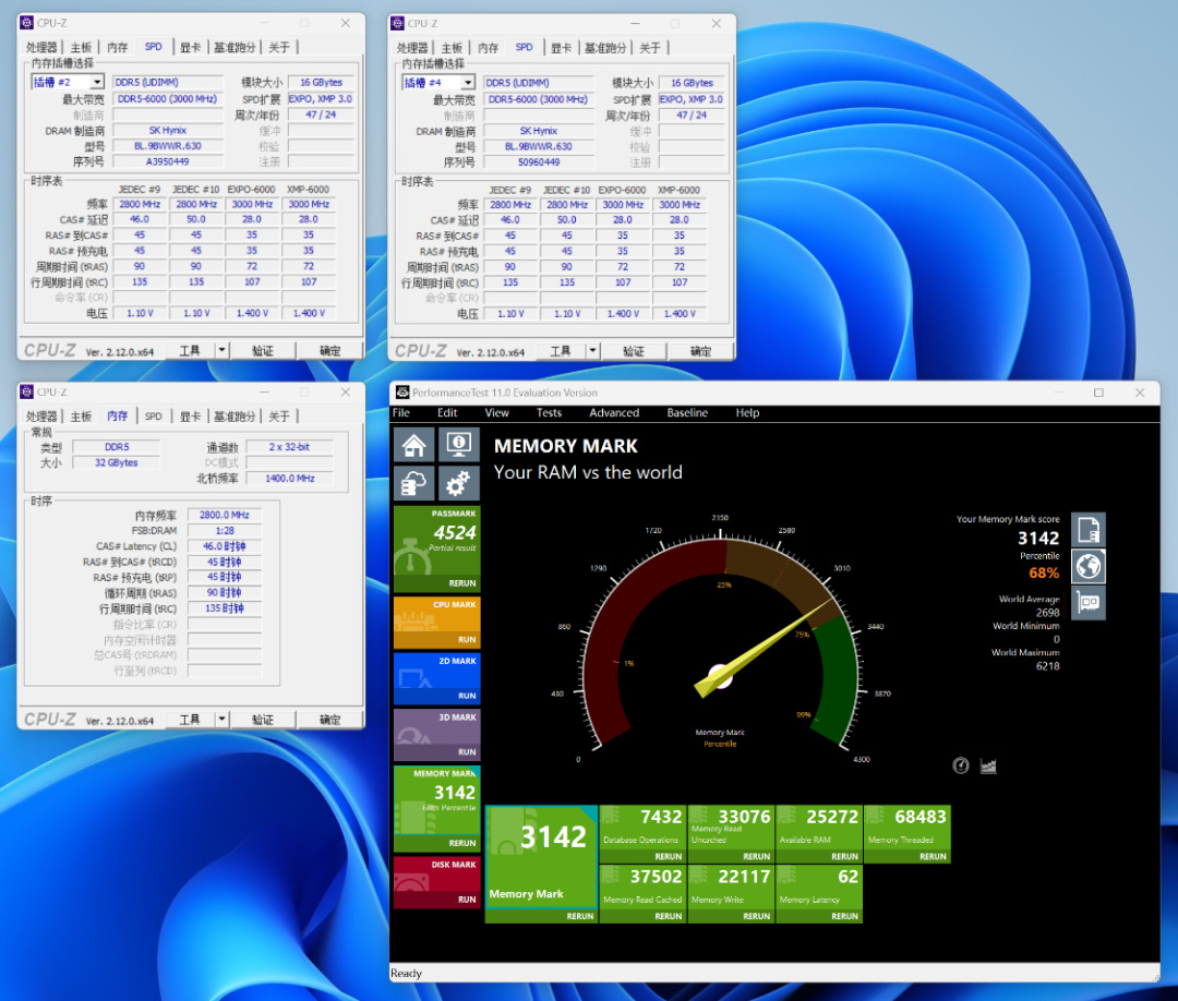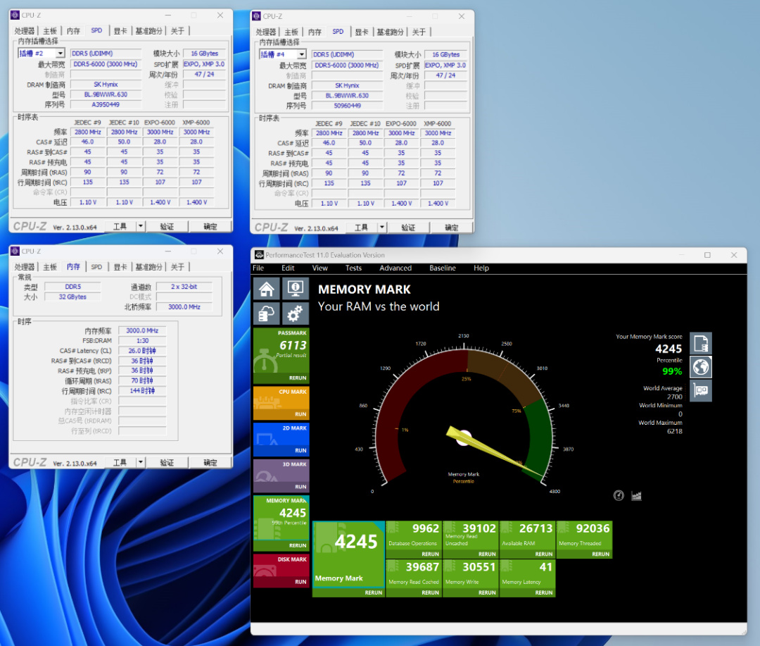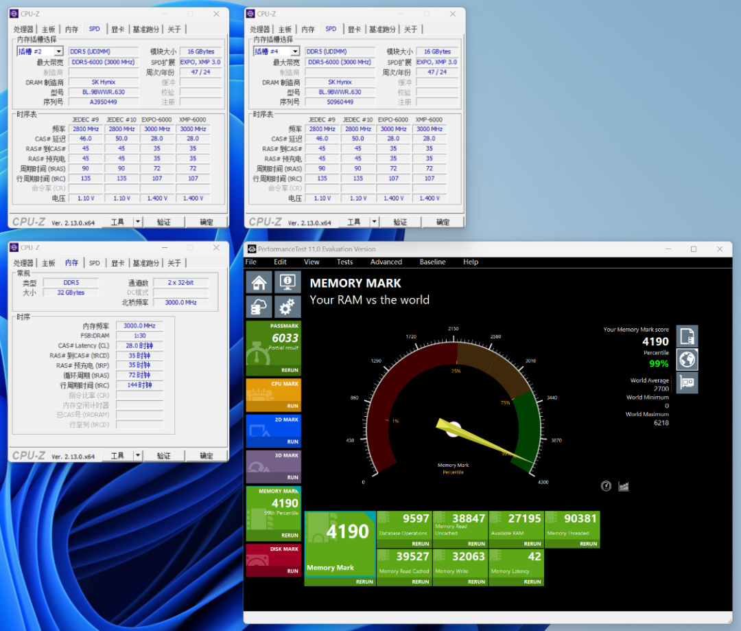 PerformanceTest 11內存測試中,原生5600MHz,內存得分3142分;EXPO至6000MHz,內存得分4190分;將時序壓低至C26-36-36-70,內存得分4245分。