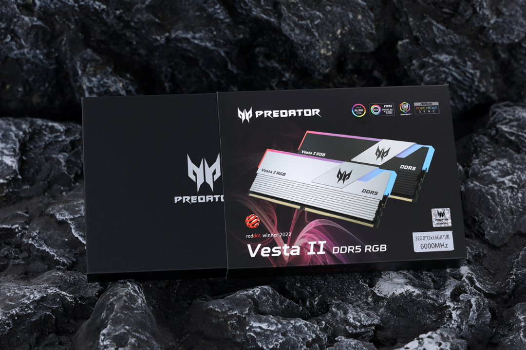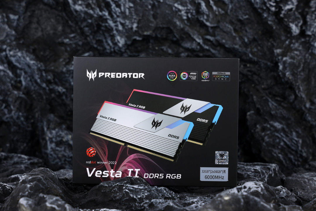 明人不說暗話,這是個人第一對宏碁內存。內存外包裝採用純黑底色,包裝正面有黑白雙色的內存本體的渲染圖,還有內存型號、頻率和容量等信息。此外,還有就是幾大板廠的燈控認證標識,左下角還有個2022年紅點獎的認證標識。至於背面則是相對常規的內存賣點介紹等信息。