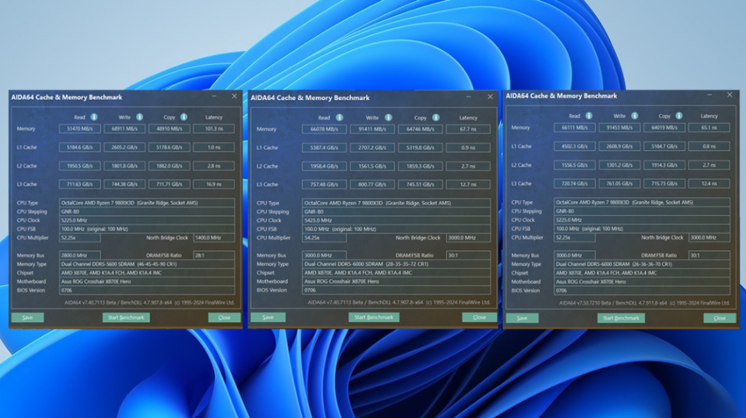 原生5600MHz,內存讀取速度爲51470 MB/s,寫入速度爲68911 MB/s,複製速度爲48910 MB/s,延時爲101.3 ns;EXPO至6000MHz後,內存讀取速度爲66078 MB/s,寫入速度爲91411 MB/s,複製速度爲64746 MB/s,延時爲67.7 ns;將時序壓低至C26-36-36-70,內存讀取速度爲66111MB/s,寫入速度爲91453 MB/s,複製速度爲64019 MB/s,延時爲65.1 ns;