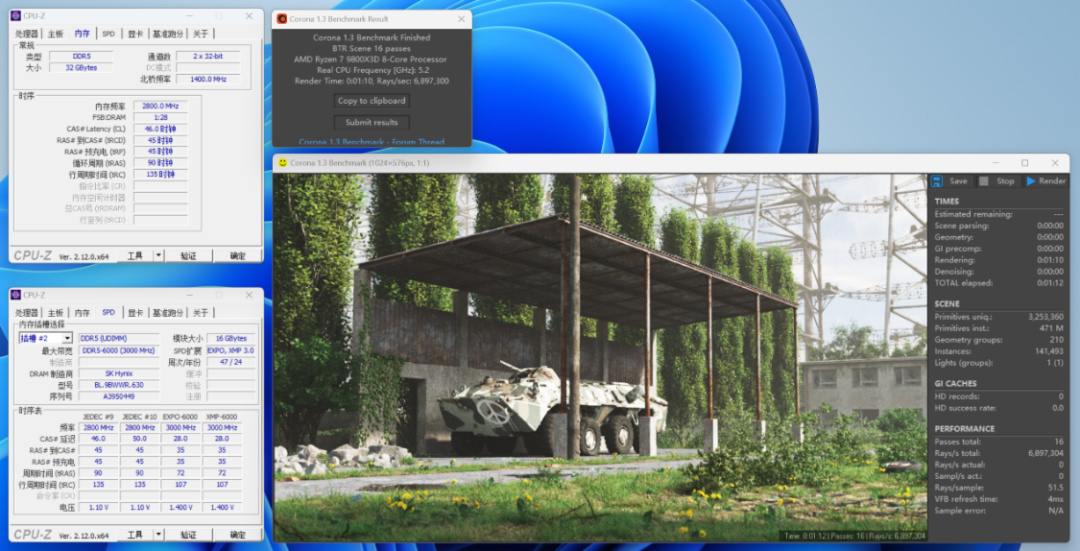 Corona 1.3 Benchmark 照片渲染測試中,原生5600MHz狀態,渲染耗時70秒,渲染速度6897300 Rays/Sec;