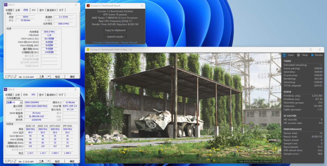 將時序壓低至C26-36-36-70,渲染耗時60秒,渲染速度8039150 Rays/Sec;