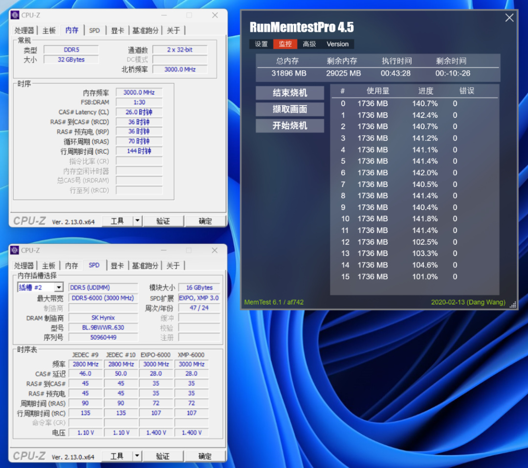 使用RunMemtestPro 4.5進行內存烤機測試,烤機43min,內存無報錯;