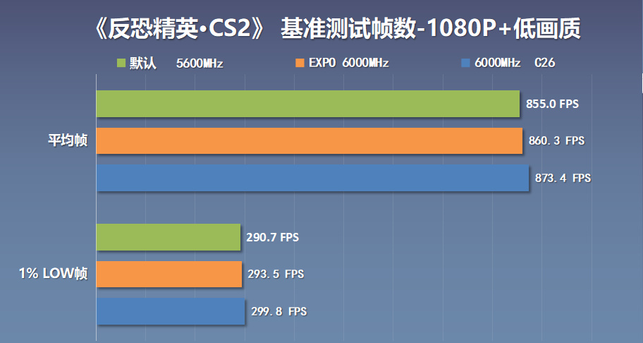 全低畫質,1080P分辨率下,內存默頻(原生5600MHz)時,遊戲平均幀數爲855FPS,1%LOW幀爲290.7 FPS。開啓EXPO至6000MHz後,遊戲平均幀數爲860.3FPS,1%LOW幀爲293.5 FPS。將時序設爲C26-36-36-70後,遊戲平均幀數爲873.4 FPS,1%LOW幀爲299.8 FPS;
