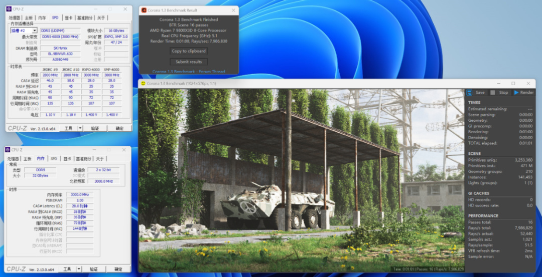 EXPO至6000MHz後,渲染耗時60秒,渲染速度7986830 Rays/Sec;
