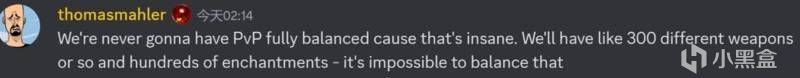 最值得大家關注的是遊戲未來玩法上,Thomas也給出了回應。未來玩法主要方向在PVE上,PVP只是打發時間的輔助娛樂。這塊就EA階段非常合理,PVE主要留住玩家,鼓勵更多玩家之間與遊戲互動,除了確保服務器的穩定外,還能繼續優化遊戲,同時初步開啓反作弊系統。PVP方面Thomas透入,正式版會有大約300種武器和數百個附魔詞條。它的加入可以讓喜歡PK的玩家彰顯實力,收集數據的同時對遊戲內的武器進行初步的平衡調整。這塊設定需要長時間的打磨,體量過於龐大