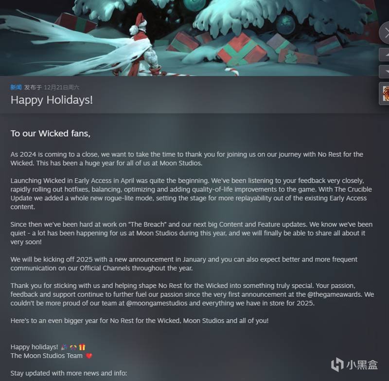 12月21日月亮組在Steam平臺公佈了《惡意不息》的最新更新時間,遊戲將於2025年1月正式發佈新公告。也就是說,最早更新時間就是明年1月,具體更新時間暫未確認。發佈公告中提及到了今年下半年發生很多事情,表示終於能夠很快分享