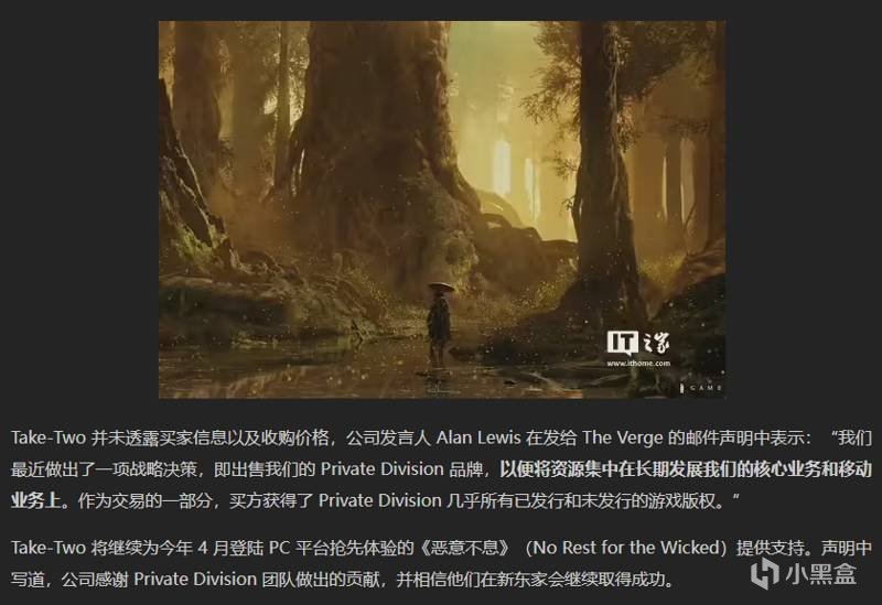 這點不得不給剛進入單機遊戲的國內玩家科普一下。網上謠傳的月亮組解散、項目黃了和開發組跑路的消息,說白了就是喫一波反面流量而已。今年11月R星母公司Take-Two只是資源重組將旗下獨立遊戲發行團隊Private Division出售了。收購方和出售資金目前並未公佈。Take-Two 將繼續爲今年4月登陸 PC 平臺搶先體驗的《惡意不息》(No Rest for the Wicked)提供支持。聲明中寫道,公司感謝Private Division團隊做出的貢獻,並相信他們在新東家會繼續取得成功