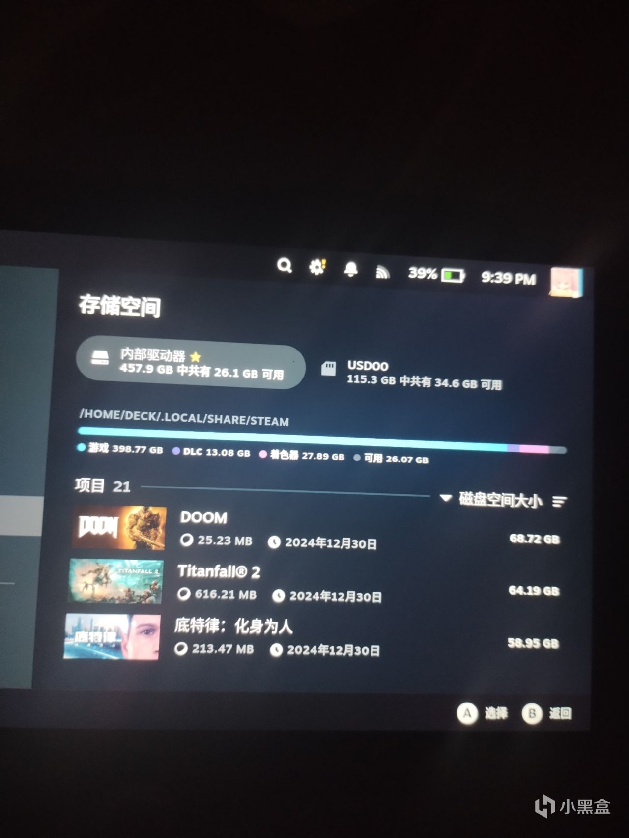 這個事其實已經困擾我比較久的時間,而且它還在不斷增長,30個G這麼大的空間已經少裝很多小遊戲,或者一箇中型遊戲了。可能是查的不對,一直沒有找到很好的方法,各種刪除之後,只能稍微減少,不能完全去除。於是我發小黑盒提問,確實有小夥伴提供方法、思路。在此由衷感謝。我也整理一下,我總結的經驗,讓後面的小夥伴少走彎路。下面是效果圖,去除之後有空間了,我又下載了一個毀滅戰士,非常可以!