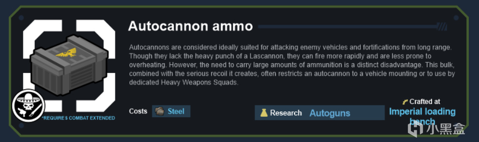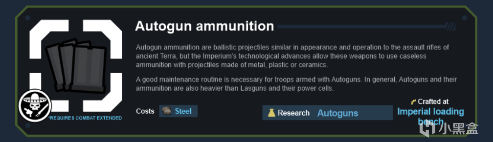 自動槍的彈藥是類似於古代地球突擊步槍的子彈,外觀和操作方式相似。但得益於帝國的技術進步,這些武器能夠使用無殼彈藥,彈頭由金屬、塑料或陶瓷材料製成。對於裝備自動槍的部隊而言,保持良好的維護是至關重要的。通常情況下,自動槍及其彈藥比激光槍和能量電池要更重。