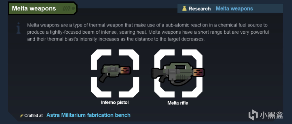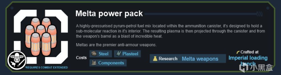 Melta武器使用一種高壓的皮魯姆-汽油燃料混合物,儲存在彈藥筒內,設計用於在其內部維持亞分子反應。由此產生的等離子體隨後被從彈藥筒中投射出來,通過武器的槍管以極高的熱量爆發的形式發射。Melta武器是頂級的反裝甲武器。