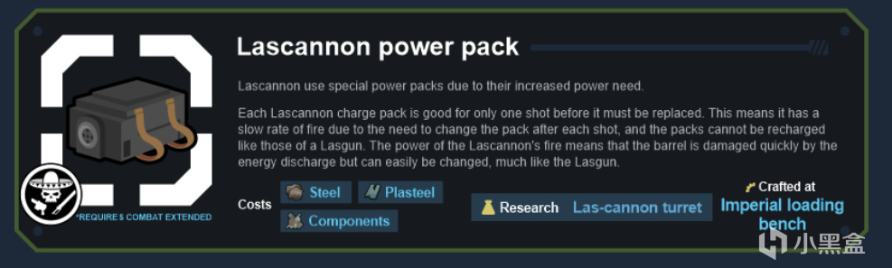 激光炮由於對能量的需求較高,使用特殊的電源包。每個激光炮電池包只能提供一次射擊後必須更換。這意味着激光炮的射速較慢,因爲每次射擊後都需要更換電池包,而且這些電池包無法像激光槍那樣進行充電。激光炮射擊時產生的強大能量使得炮管在短時間內會受到損傷,但更換炮管相對容易,類似於激光槍的設計。