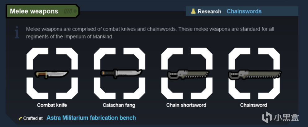 近戰武器包括戰鬥刀和鏈鋸劍,這些近戰武器是人類帝國所有兵團的標準裝備。