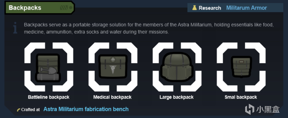分爲戰線揹包、醫療揹包、大型揹包、小型揹包,製作於星界軍制造臺(Astra Militarum Fabrication Bench)