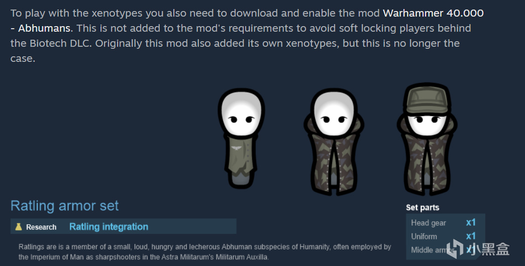 爲了使用這些聯動物品,您需要下載Warhammer 40,000 - Abhumans這個mod,該模組未包含在主模組的要求中,旨在避免玩家因爲缺少 Biotech DLC 而導致功能鎖定。