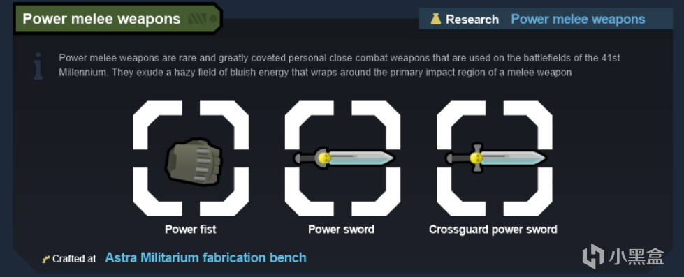 動力近戰武器是一種稀有且備受追捧的個人近戰武器,廣泛活躍於第41千年的戰場。它們在武器的主要打擊區域周圍釋放出一層朦朧的藍色能量場,極具威懾力。