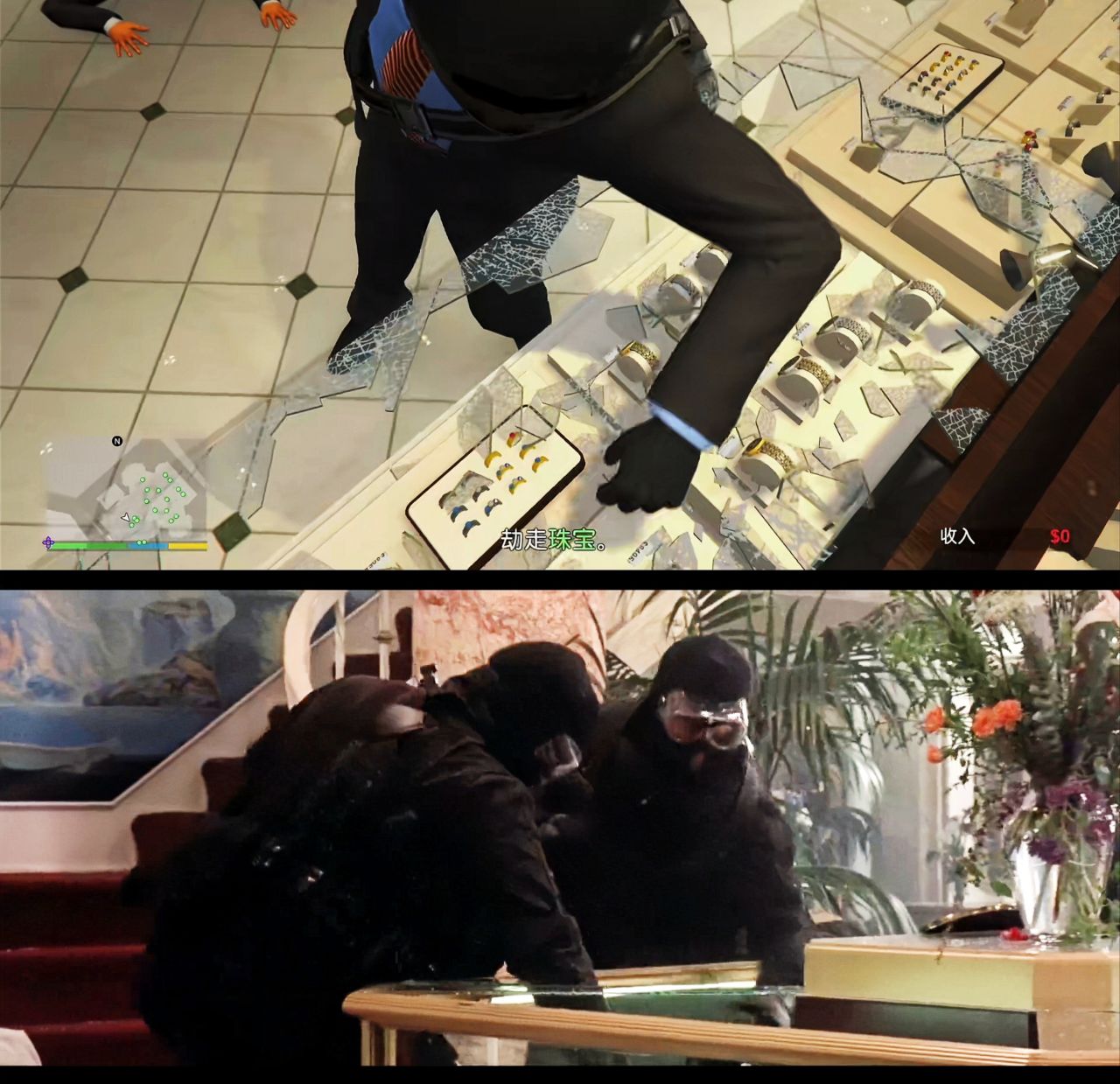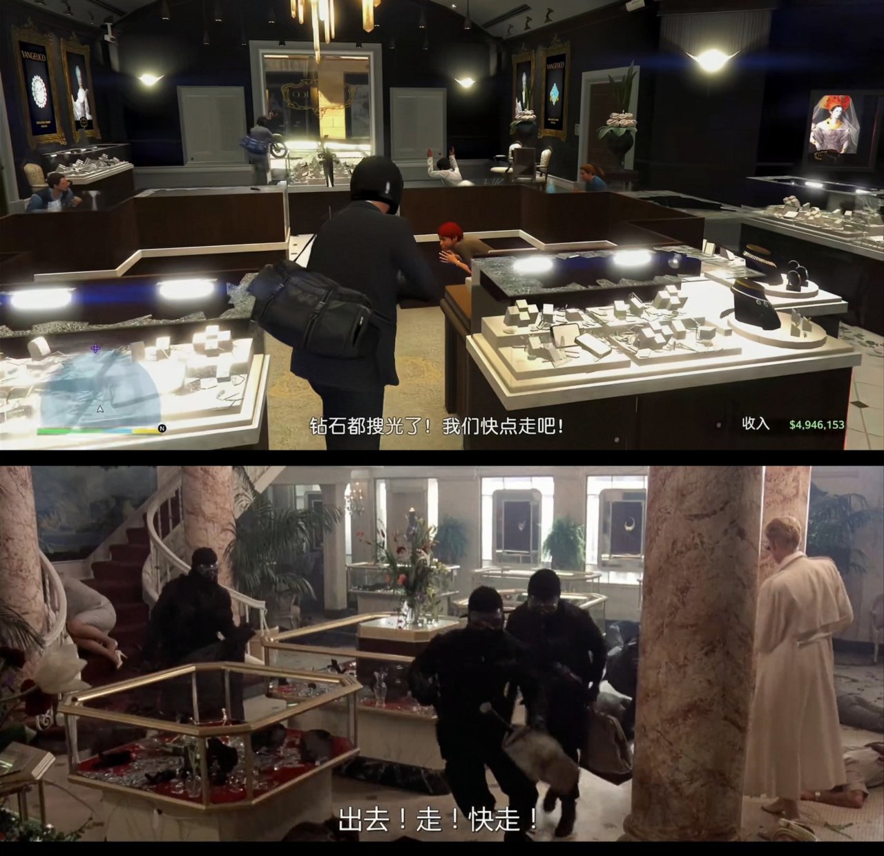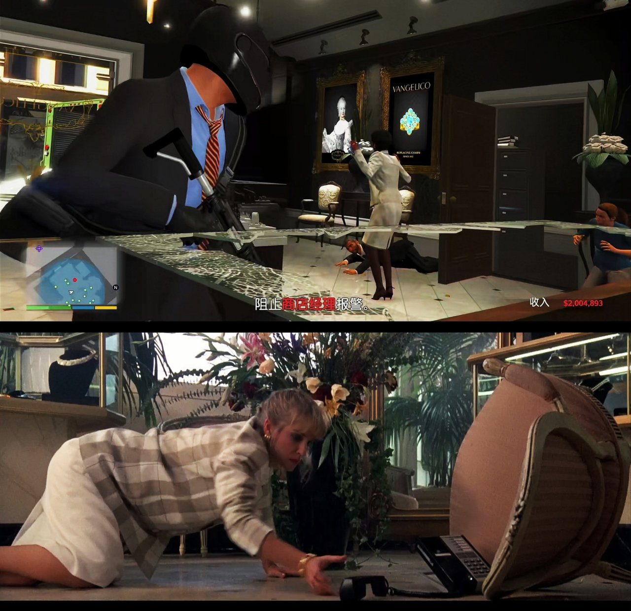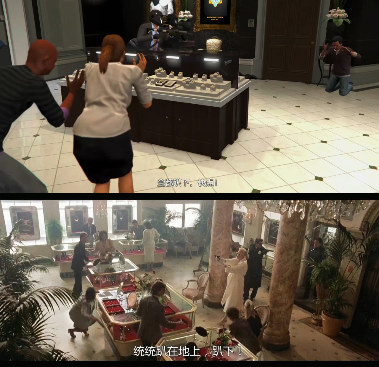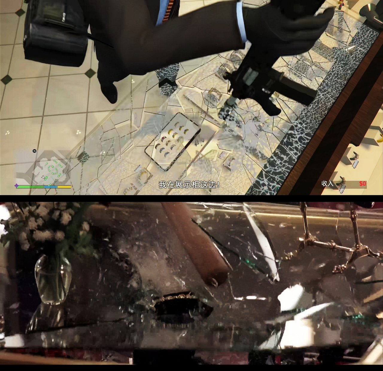 擊碎珠寶店內擺放財物的玻璃展櫃,電影裏使用的道具是木質棒球棍進行敲擊,遊戲中爲卡賓步槍的槍托。