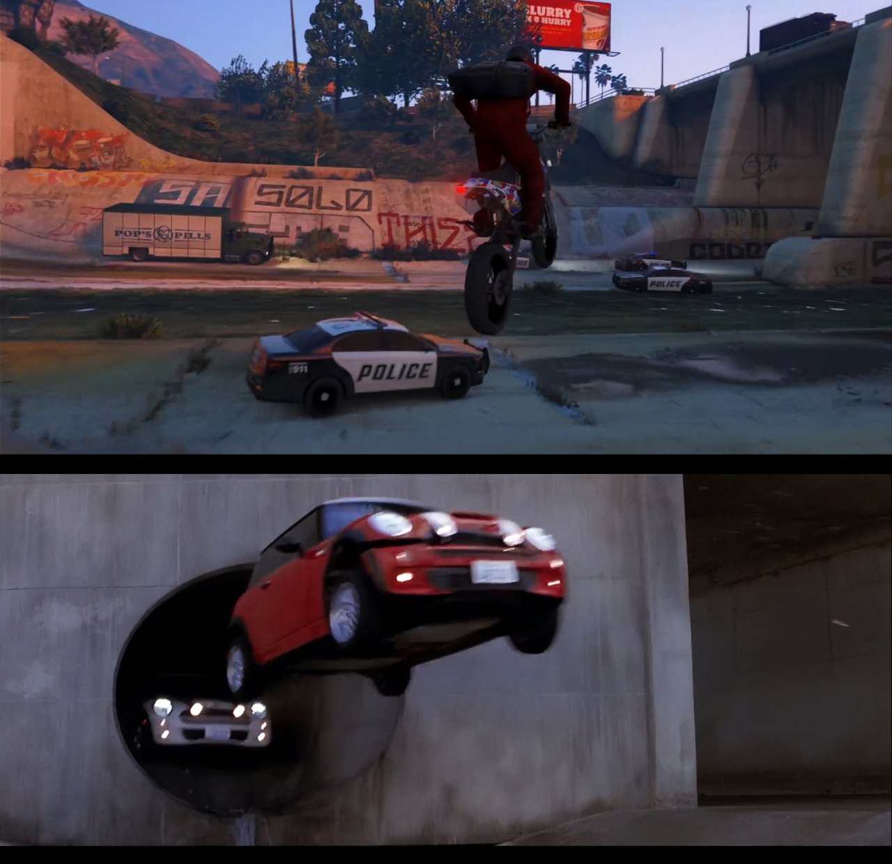 以及穿越層層障礙後成功到達出口時的摩托飛躍鏡頭,也同樣來自這部以洛杉磯爲故事背景的電影。