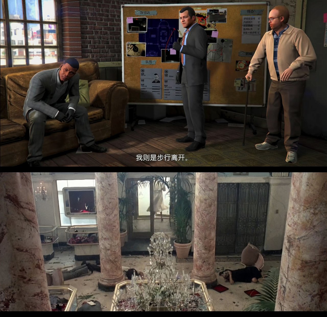 與電影橋段裏最後負責劫案的指揮是從正門步行撤離一樣,麥克也沒有加入與富蘭克林等人的摩托追逐部分,而且在行動開始前就介紹自己會選擇以步行的方式進行脫身。