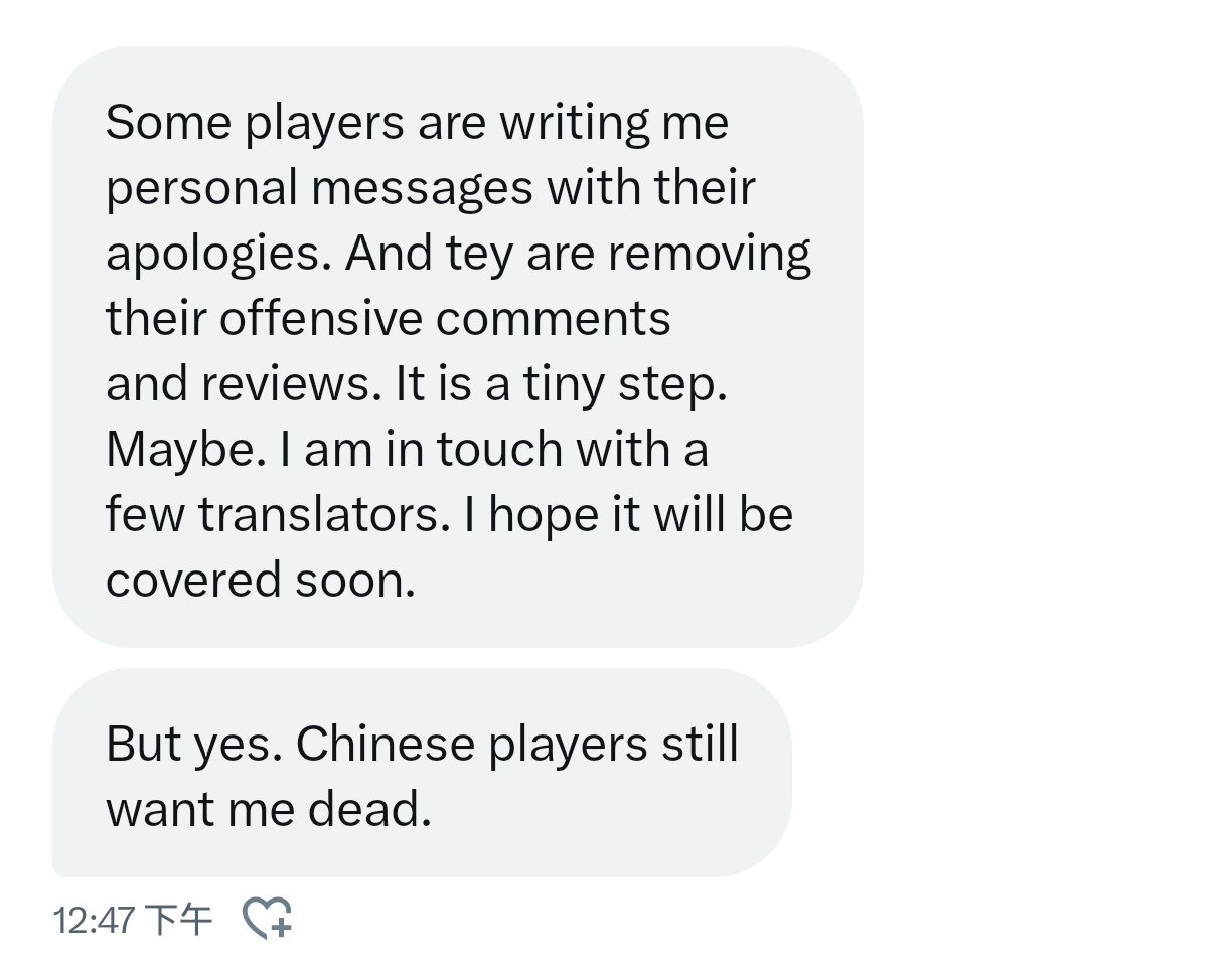 一部分兔子玩家已经和我道过歉了,他们正在逐步删除并将他们的差评改为好评,这对我来说是一个小的进步,我刚刚还与一些兔子翻译取得联系,我希望这些负面评论很快被覆盖