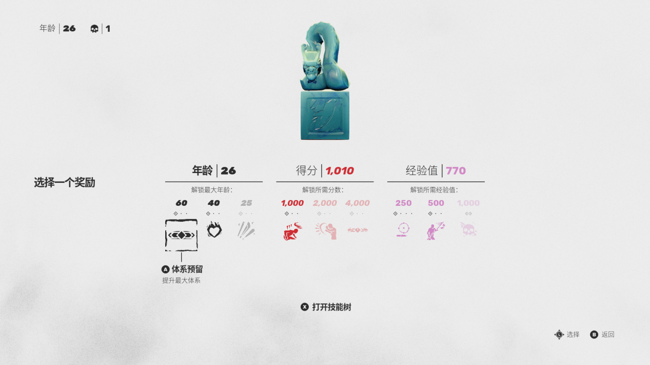本作的最爲特殊的角色死亡機制,也是核心系統便是年齡。當主角在戰鬥中死亡時,並不會直接重啓關卡,主角擁有的銅錢吊墜會把你原地復活,代價是你的年齡會立刻增加一定數目,起步加上一歲。同時消耗銅錢的耐久,直到全部五枚銅錢都因角色的死亡而碎裂後,主角也將徹底死亡,玩家必須重新挑戰整個關卡,之前獲得的經驗和學會的技能,也將全部清零。主角變老的影響體現在多個方面,年齡增大主角的 HP 上限會減少,攻擊力則會提升,所以過早變老增加了傷害 ,但血量容錯降低 ,而且會鎖死一部分技能無法學習,是把雙刃劍。