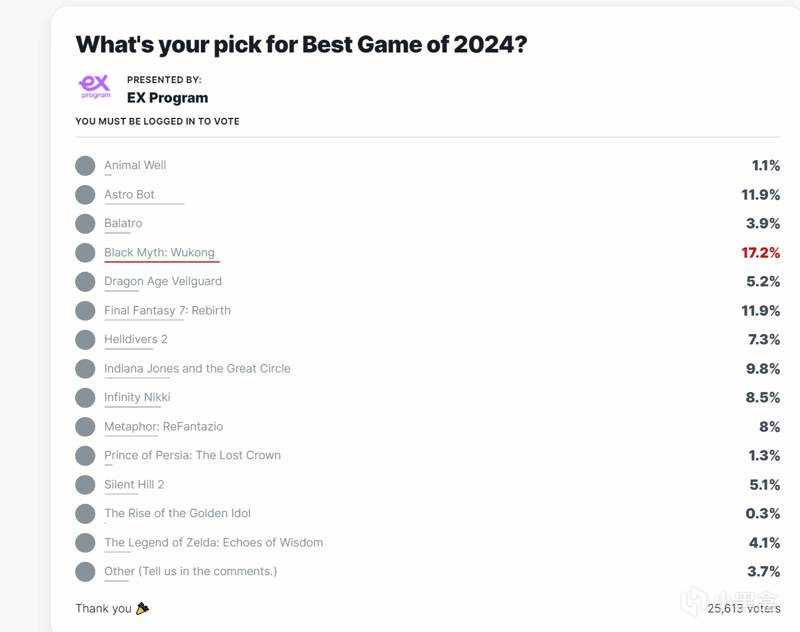 TGA公佈年度遊戲當天,相信很多國人玩家都哭笑不得,爲《黑神話悟空》打抱不平的也着實不少。近日隨着IGN年度各大獎項公佈,再次見證了國產遊戲踏出國門第一步的不易。TGA年度公佈後,IGN第一時間發起了2024年度遊戲的投票。《黑神話悟空》以極大優勢位列第一,然而公佈當天卻讓所有玩家大跌眼鏡