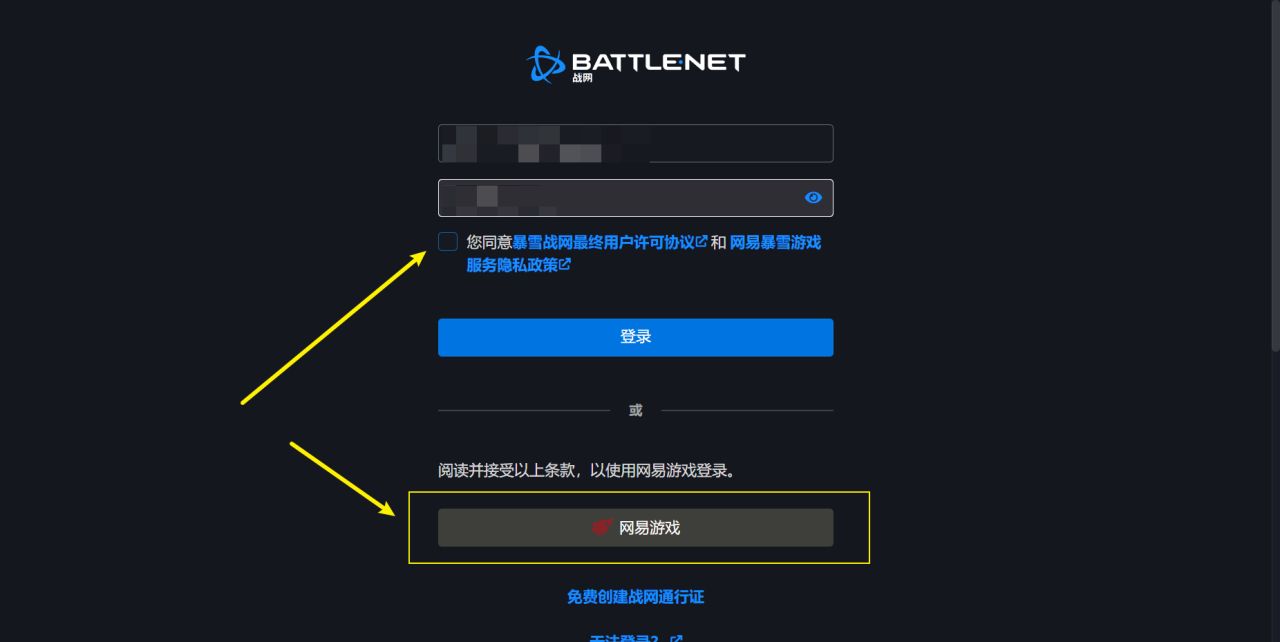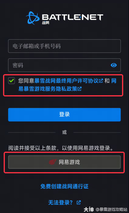 h、打开战网客户端或是战网网页,阅读并勾选同意条款,点击网易游戏按钮,登录已实名迁移的网易账号