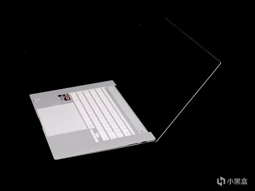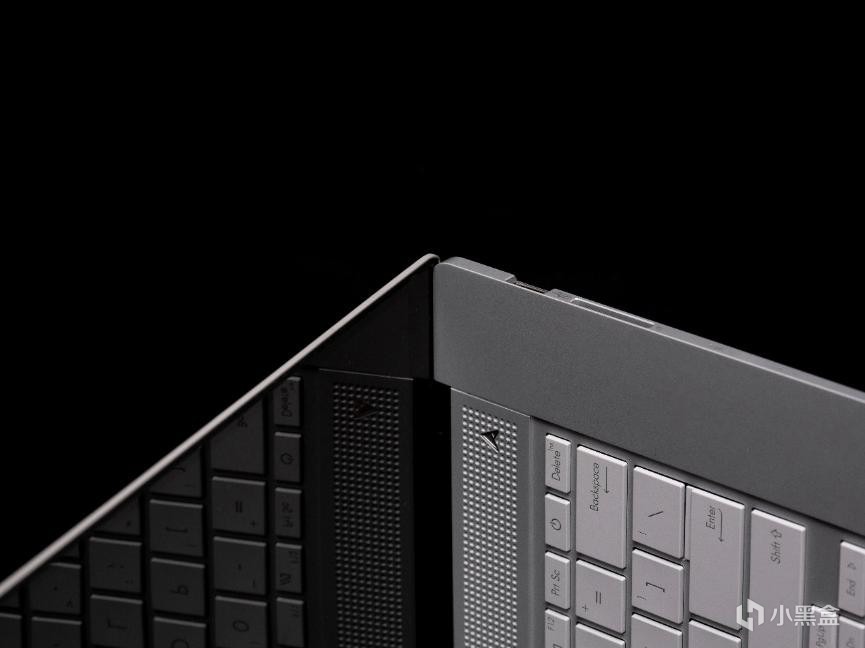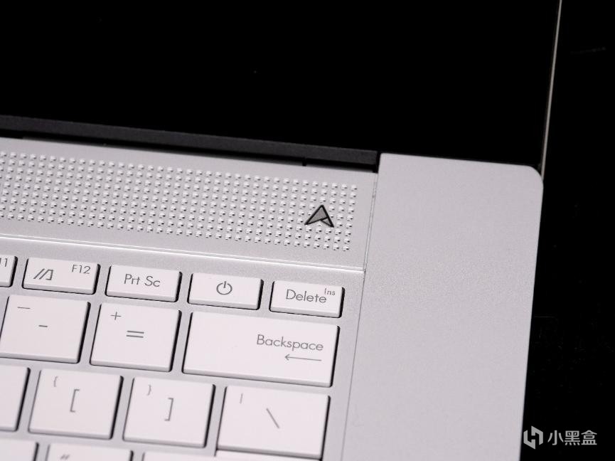 Power键设计在顶排右二,感觉如果能整合到上方的LOGO上就更好了。而上方这个几何格栅设计除了单纯炫技之外,也是一种巧思,宣称空气流动效率提升50%,能释放更多的热量,有效规避传统隐藏式屏轴积热的通病,这点确实加分。