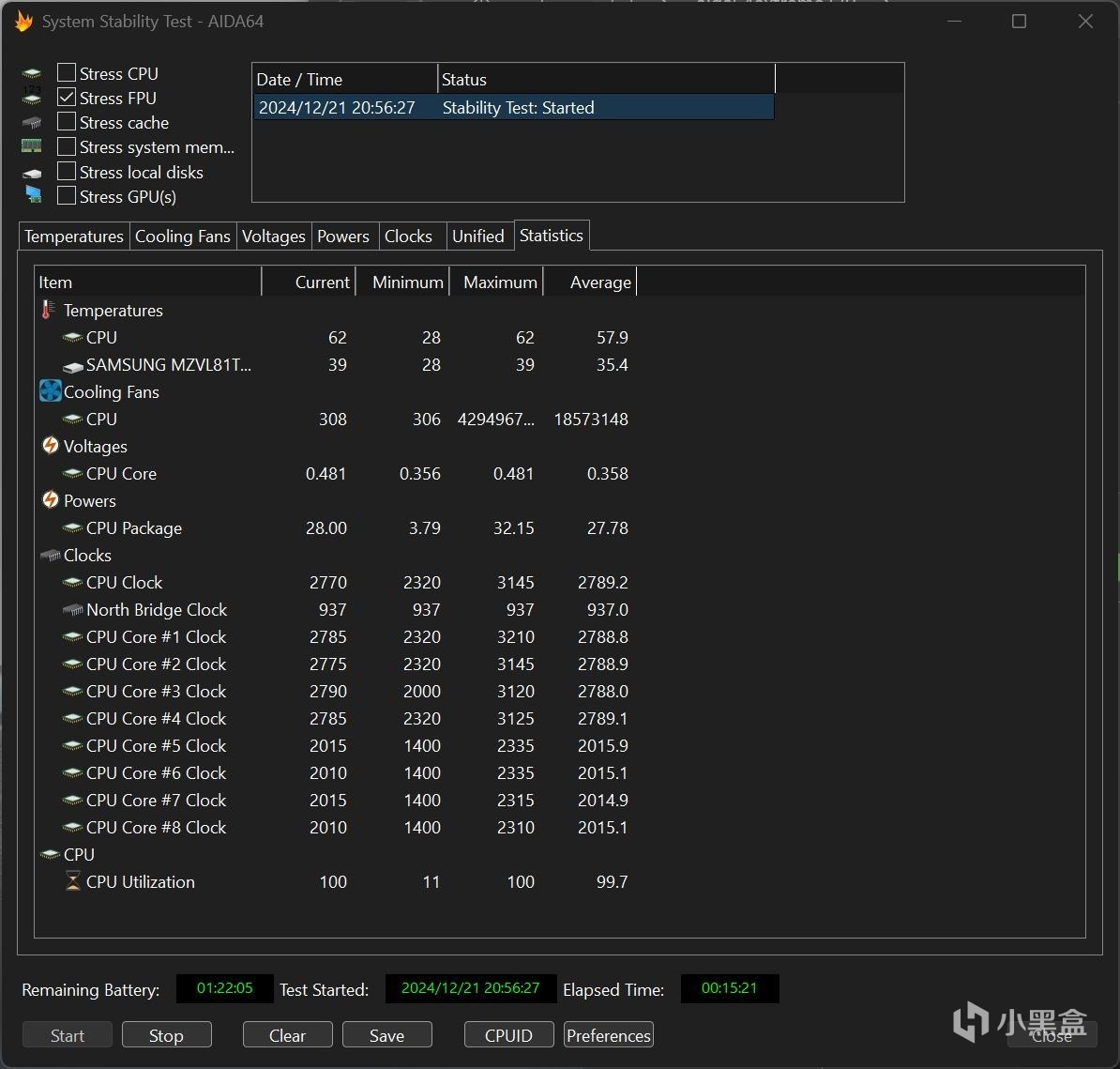 AIDA64 FPU单烤15分钟+,功耗28W,ZEN5核心主频2.8G,温度只有62度,风扇转速308。根本就没转……噪音控制在35厘米近人位37db,高效的散热结构保证了良好的表现。甚至有点过于“冷静”了,在我看来给到100W MAX,CPU提到55W左右都完全没问题。但是可能就和现在这种冷峻的定位不相匹配了。