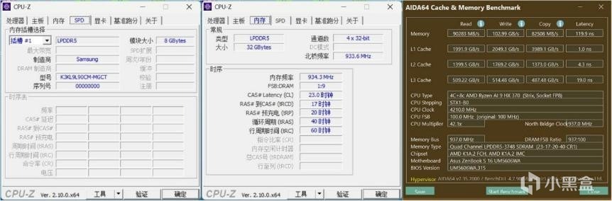 内存是由4颗8G组成7500MHz的32GB LPDDR5X内存。虽然默认开启了虚拟化安全略微影响了一点内存性能,但是仍然能看出7500MHz在读写带宽上的强大能力,这也是AI性能发挥的重要保证。