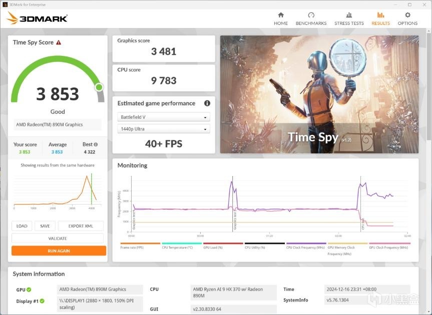 Time Spy 9783,Graphic 3481,总分3853。这就是轻薄本+集成显卡的实力吗,比前几年的游戏本都强了!