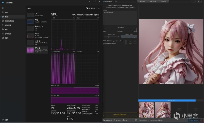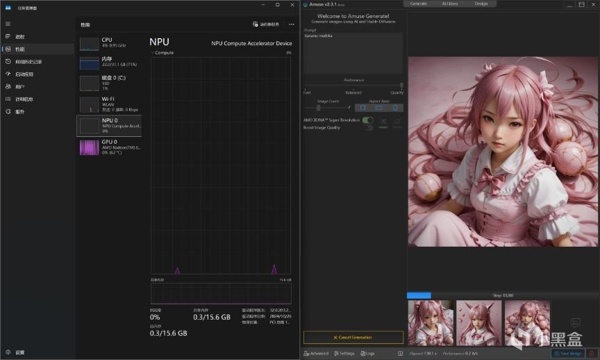 AI应用方面,目前能够最大化发挥NPU+GPU AI性能的软件莫过于当红的AMUSE,不过目前Amuse的主要门槛还是在于网络环境上,虽然Amuse的不断升级,易用性上也在不断提升,特别是SDXL Turbo的优化上,文生图、图生图,成功率,易用性都越来越强,但是没有一个高速网络是玩不转的——那些模型一个比一个大。