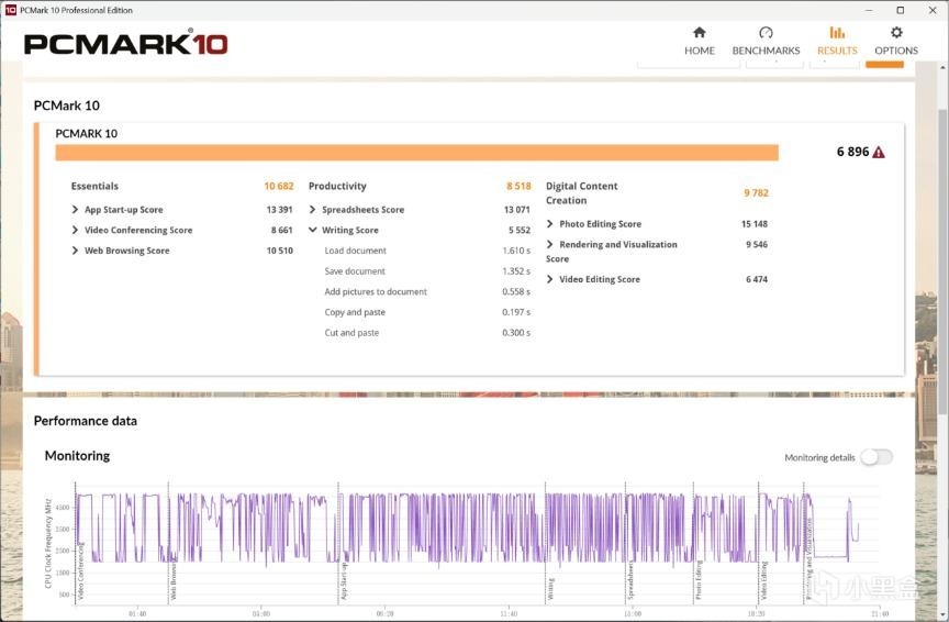 PCMARK 10 成绩6896,CPU运行全程维持在4.8G以上的高频,成绩非常不错。