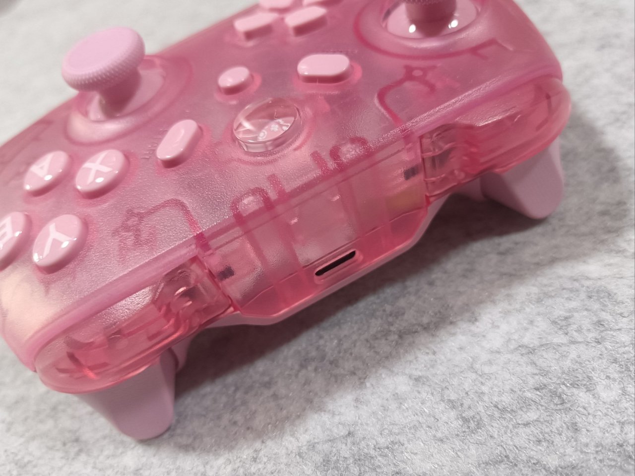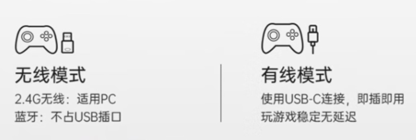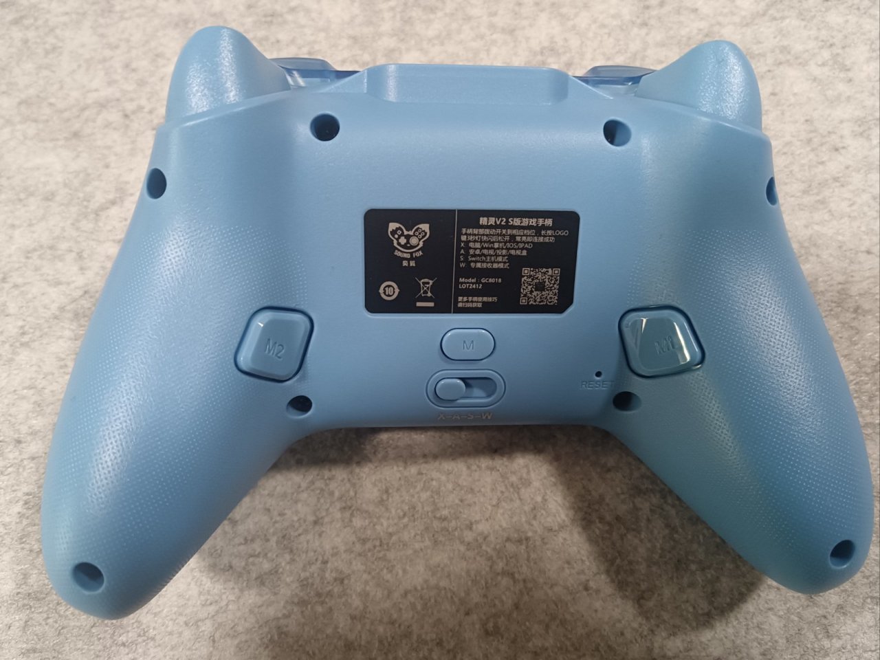 还是先从连接方式谈起吧,这次因为要压缩成本,所以数据线也都没得了,接口都是TAP-C接口,值得注意哈,数据线大家都有,随便找一个都行,但如果要充电的话就得注意了,充电器恒定电压不得大于5V(电流不得大于2A)否则可能造成手柄电池损坏,所以想使用快充充电器的玩家还是得注意一下的,别充个电手柄“炸了”手柄三模连接方式:有线/2.4G无线/蓝牙。