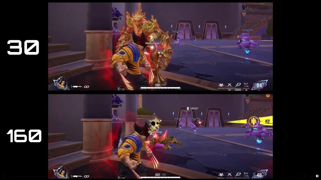 “nyin_”一共在30fps和120fps的环境下对比了5位会因低帧率而受到影响的英雄角色,分别是奇异博士、金刚狼、毒液、秘客和星爵,可以明显的看到在低帧率情况下,这些角色的跳跃、移动、攻击次数、冲刺距离等方面性能全都受到影响而降低。