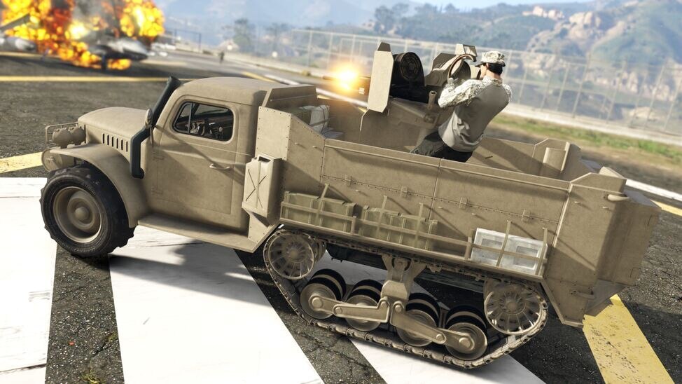 載具評測:半履戰車能應付所有地面衝突,履帶設計使車輛具備極高的通過能力,能征服絕大部分陡峭斜坡;自帶高涉水喉,即使淹過駕駛室也能正常行駛;防禦能力較強,能承受多次導彈襲擊,除側窗外免疫所有方向襲來的子彈。後方炮塔有一定的輸出能力,但炮手無法獲得良好的保護,拖載防空拖車或許是更好的選擇。