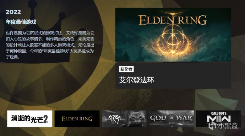 恭喜《艾爾登法環》獨佔兩元,成爲2022 年Steam大獎最大的玩家。2022年剛過,根據相關遊戲媒體的統計,《艾爾登法環》已經獲得了281個由專業評委選出的年度大獎,觀衆選擇投票選出的有43個獎。如果這兩個數字相加,《艾爾登法環》在一年的獲獎數量,已經超過前輩熱門大作《最後的生還者2》了,當之無愧的年度“爆款”。