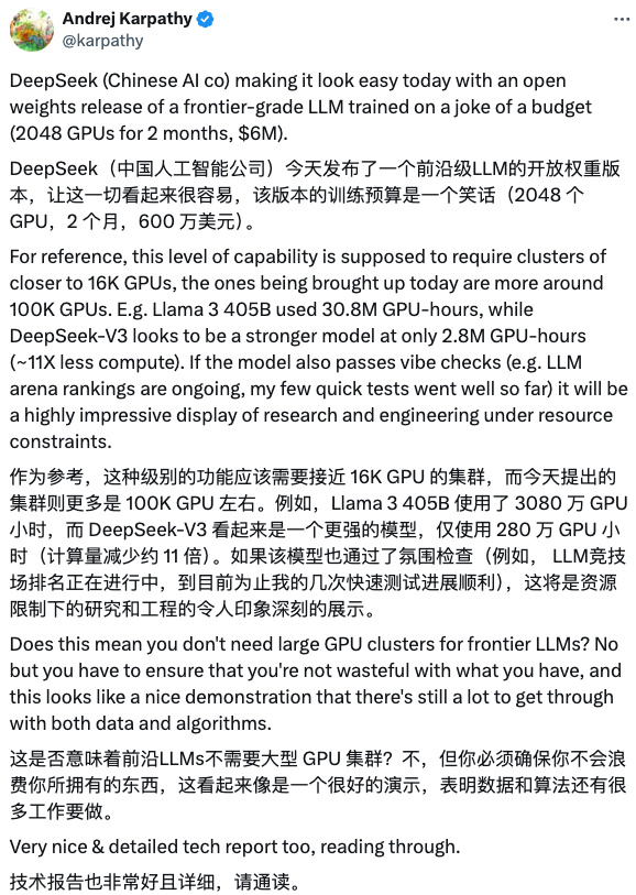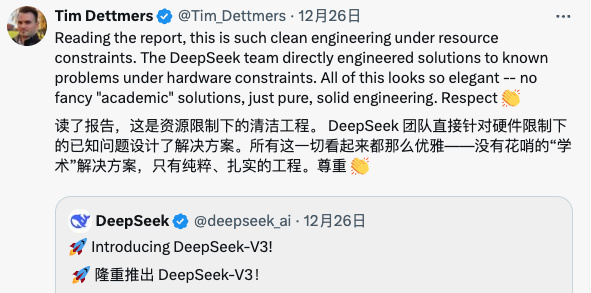 知名 AI 评测博主 Tim Dettmers ,直接吹起来了,表示 DeepSeek 的处理优雅 “elegant” 。