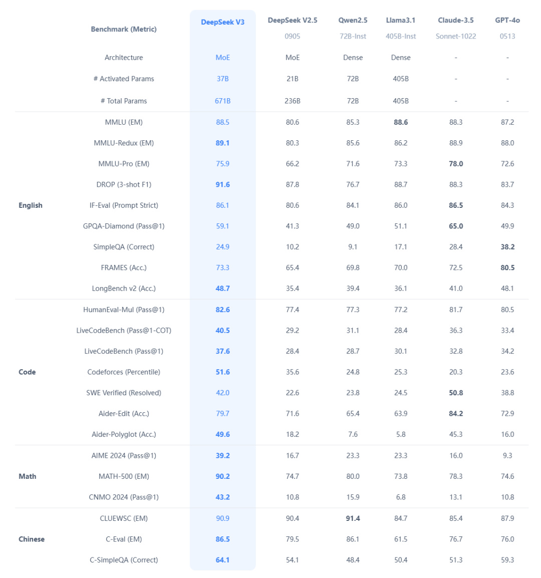 而在各种大厂手里的闭源模型,那些大家耳熟能详的什么 GPT-4o 、 Claude 3.5 Sonnet 啥的, V3 也能打得有来有回。